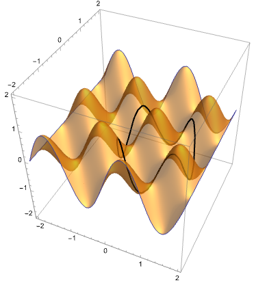 We want to understand the extrema of the function whose contours are plotted above, but only along the curve \(g(x,y) = 3\) (in black). Switching to the \(z = f(x,y)\) surface plot perspective, we have: