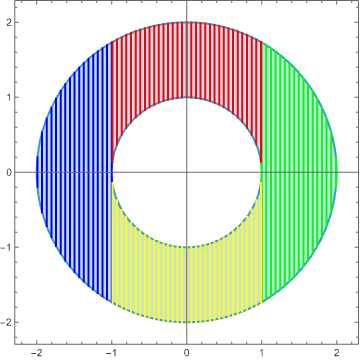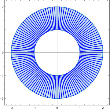 To see how useful polar coordinates can be, consider a double integral over the annulus of inner radius \(1\) and outer radius \(2\) centered at the origin. In Cartesian coordinates, the inner circle is defined by the implicit equation \(x^2 + y^2 = 1\), and the outer circle by \(x^2 + y^2 = 4\). In polar coordinates, the inner circle is simply \(r = 1\) and the outer circle \(r = 2\). This is already nice, but consider how much simpler the slicing becomes: